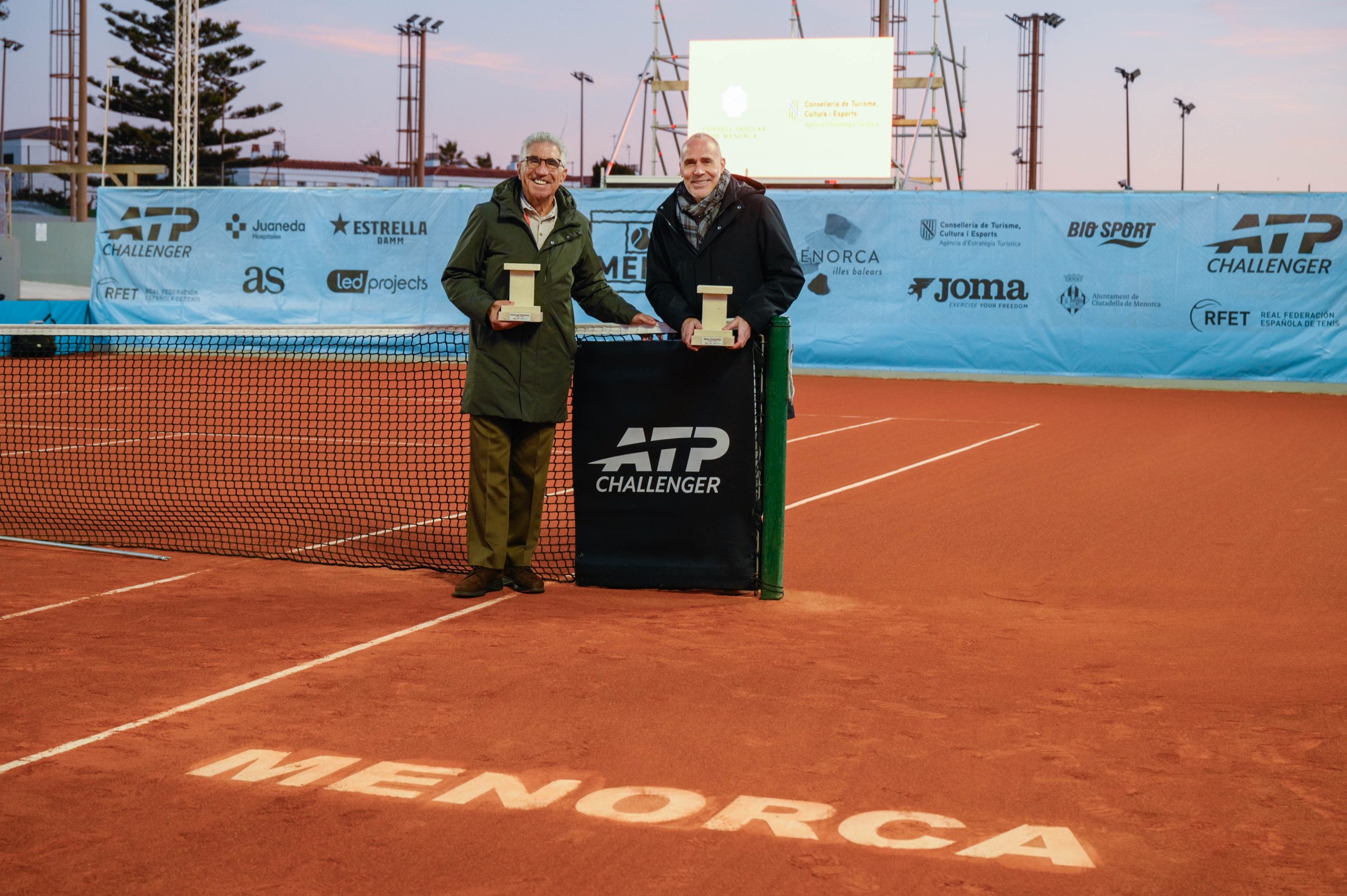 El homenaje contó con la participación de Adolfo Villafranca, presidente del Consell Insular de Menorca; Ahmed Abdel-Azim, supervisor de la ATP; Miguel Ángel Plasencia, vicepresidente del Club Tenis Ciutadella; y Toni Capó, CEO de BioSport y promotor del torneo, junto a los propios homenajeados.